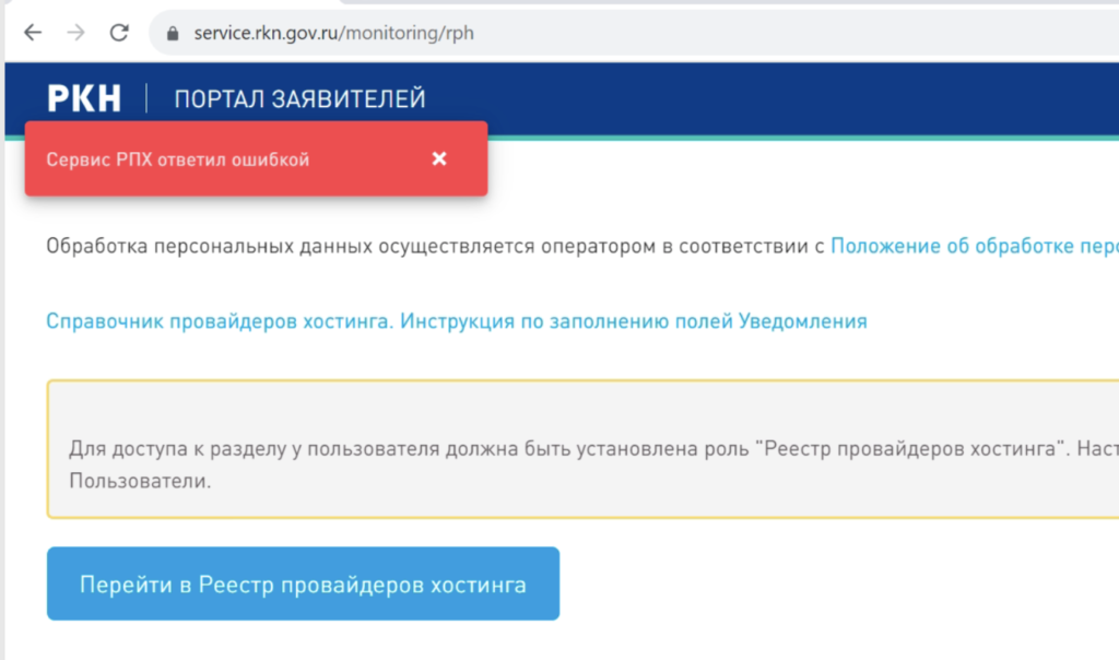 Для доступа к разделу заявлений нужно пользователю портала добавить права «Реестр провайдеров хостинга». Без этого не поедет. Возможно, надо будет выйти, потом снова авторизоваться.